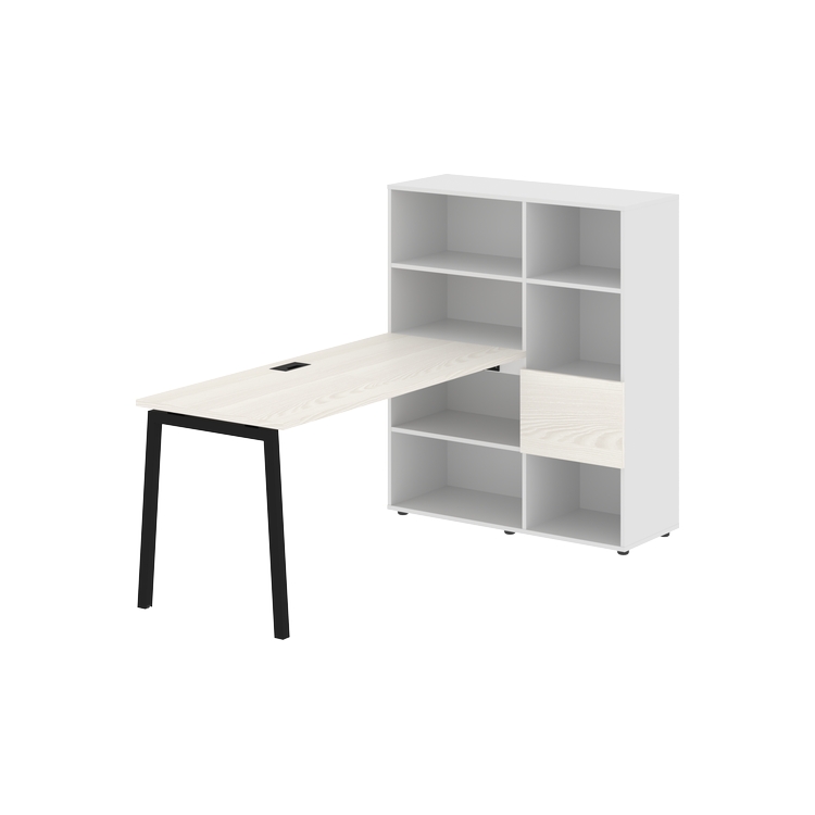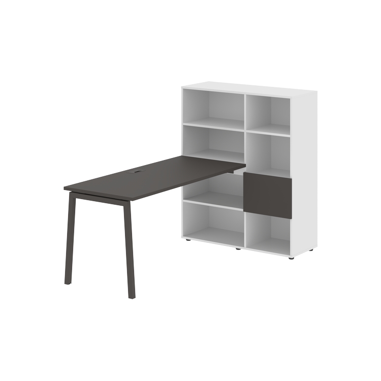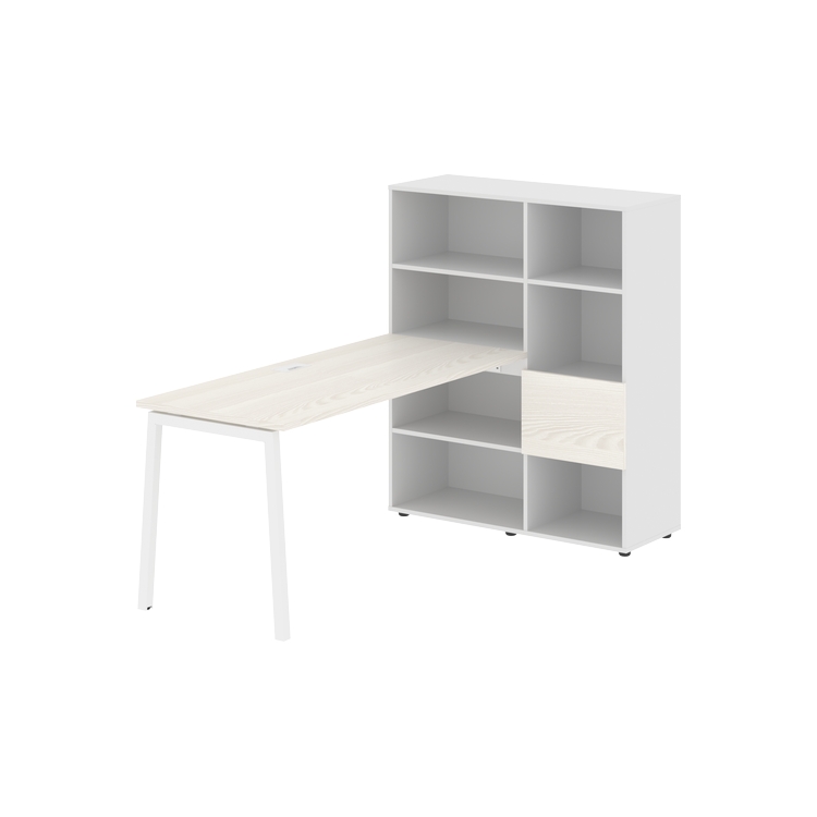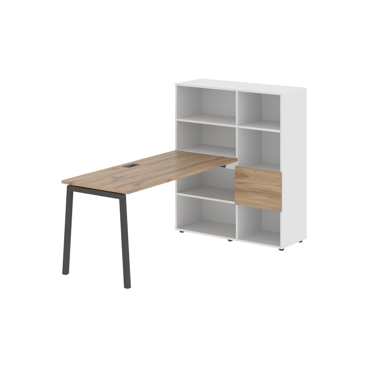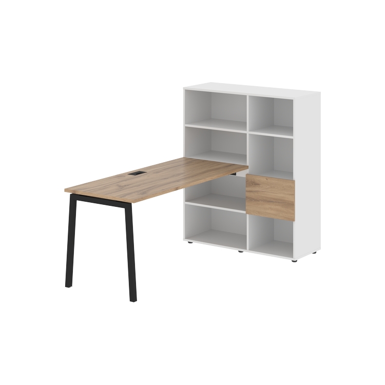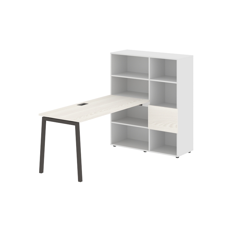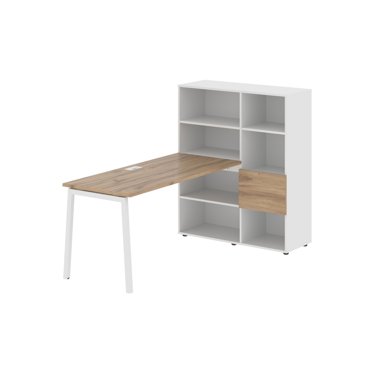 Каркасы стеллажей полностью из ЛДСП т.18 мм с кромками ПВХ т.2 и 0,45 мм, задняя стенка из ЛДСП. Комплектуется малой дверью в цвет столешницы и регулируемыми опорами h= 27 мм.