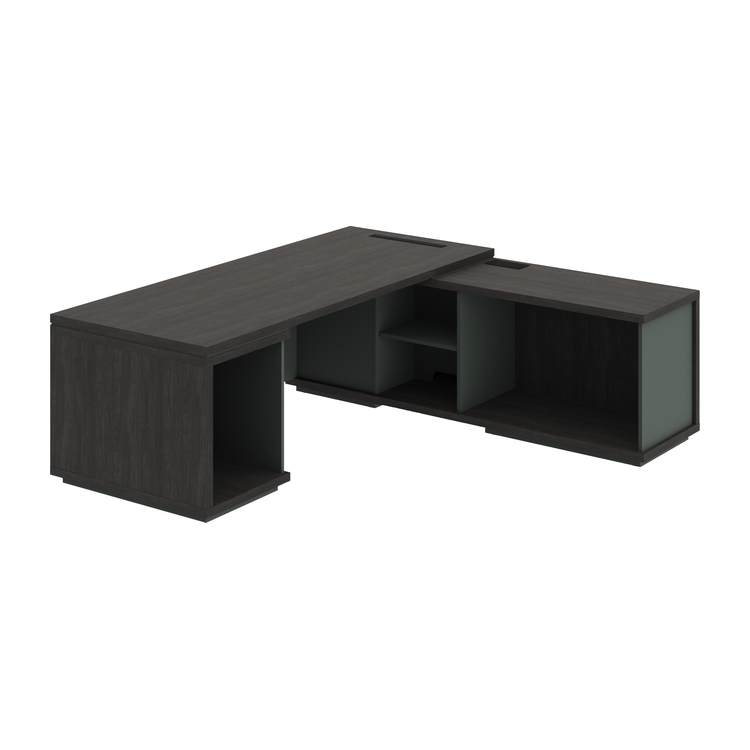 Каркас стола руководителя с опорными тумбами правый. Столешница размером 2000х900 мм выполнена из ЛДСП толщиной 38 мм в изысканном цвете «Дуб Шерман антрацит». Фронтальный щит, верх, низ и задняя стенка тумб продолжают концепцию в том же стиле. Видимые элементы из ЛМДФ «Зелёный камень» с матовой поверхностью PerfectSense Matt придают столу современный вид.